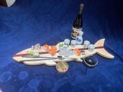 When College students call a Charcuterie Board a "Shark Coochie" board, you have to respond with the perfect themed board. Our Shark-cuterie board measures 29 3/4" at the longest and 8 1/2" at the widest point. This board is made of Hard Maple with a stip of Purple Heart from nose to tail. This board is approximately 3/4" thick and has an eye and gills engraved.